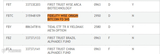 12月8日,富达现货比特币ETF“FIDELITY WISE ORIGIN BITCOIN FD SHS”已被列入美国证券存托清算公司(DTCC)活跃ETF和预发行名单,交易代码为FBTC 。