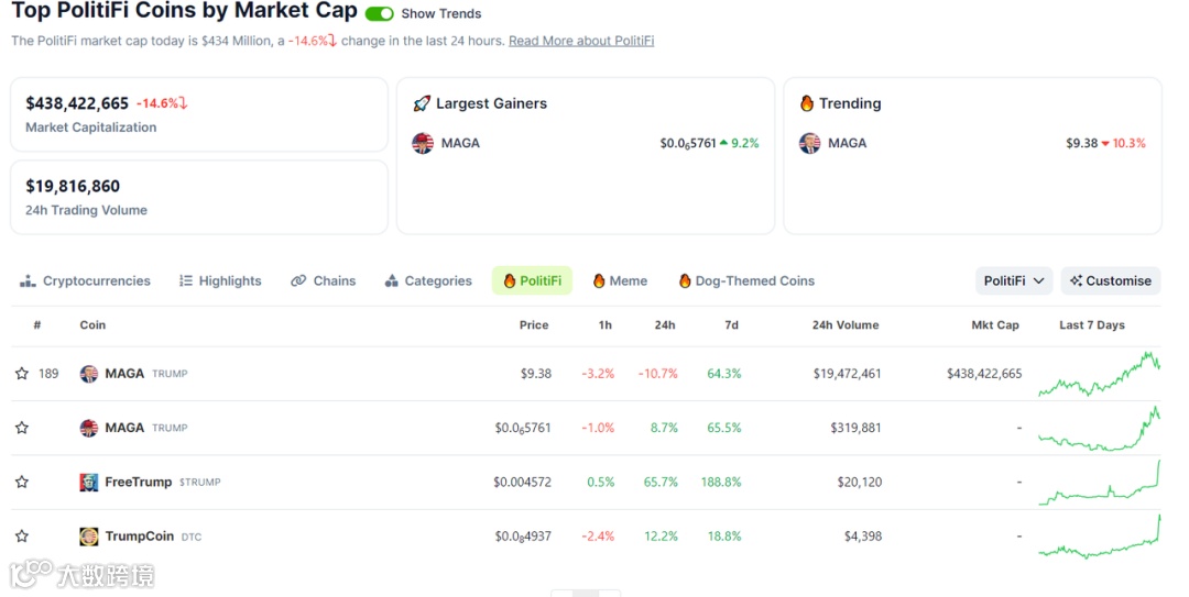 所以我们不难理解,为何头部行情数据网站CoinGecko会将PolitiFi单独列为一个版块进行展示:Meme币已经从最早期的动物概念,延展到了时下最热门的政治领域。