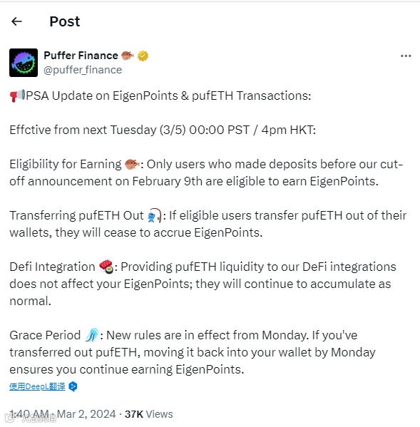 3月2日以太坊流动性质押协议 Puffer Finance 将于北京时间 3 月 5 日 16:00 起更新 EigenLayer 积分与 pufETH 积分制度。