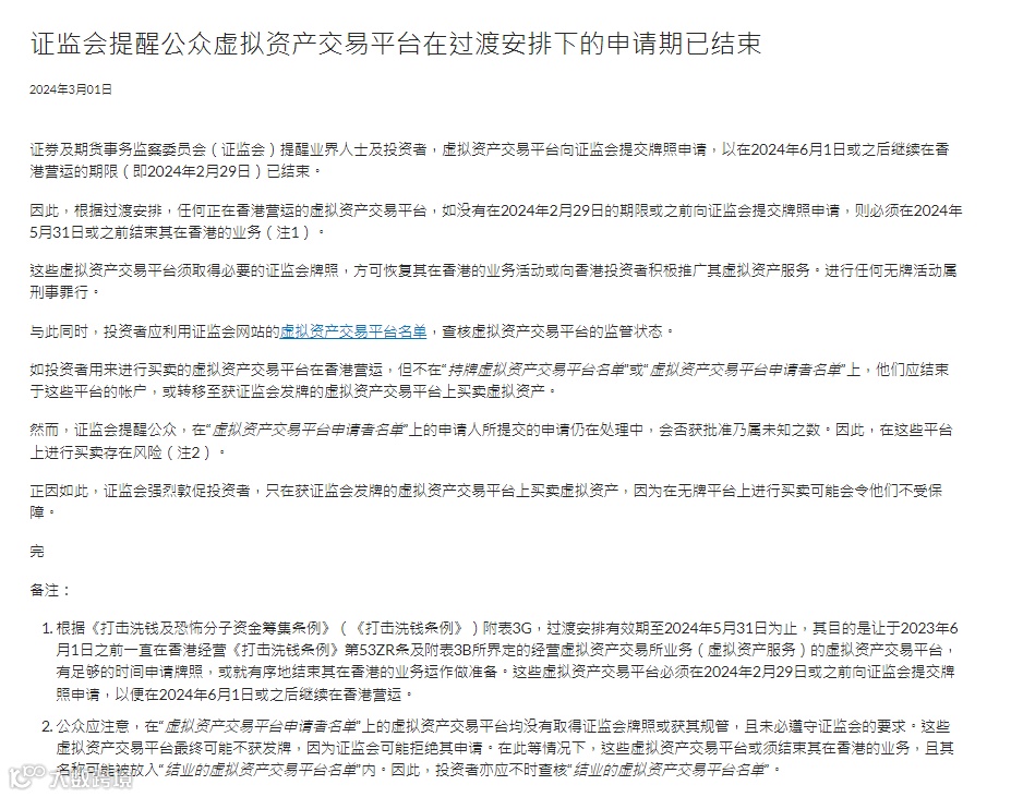 3月1日,香港证券及期货事务监察委员会(证监会)提醒行业人士及投资者,向证监会提交虚拟资产交易平台牌照申请以继续在香港运营的期限已于2024年2月29日结束。