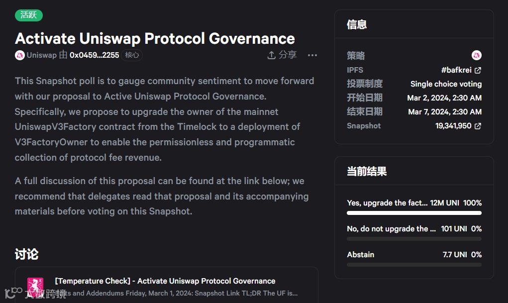 3月2日,Snapshot页面显示,Uniswap已发起“激活Uniswap协议治理”提案投票。据悉本次链上投票将于 3月7日结束,目前支持率为100%。