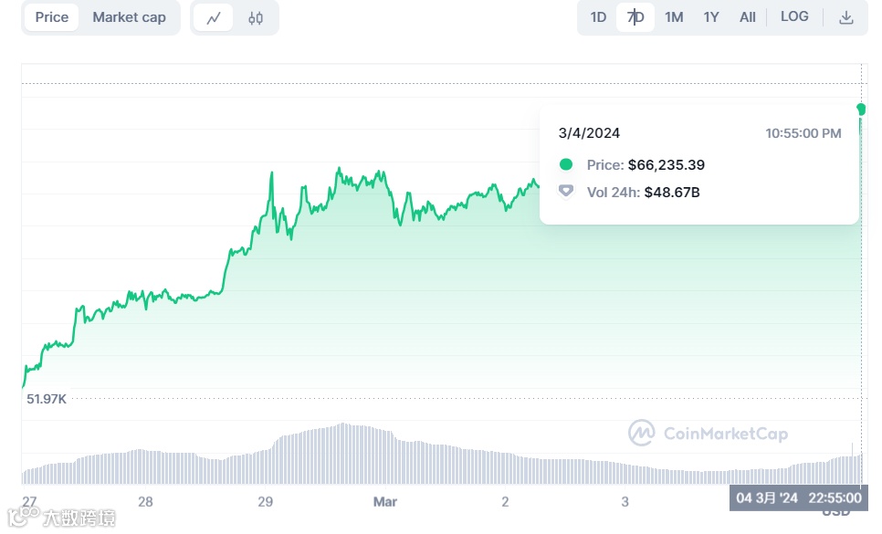 3月4日,欧易OKX行情显示,BTC价格触及66000美元,日内涨幅约6.15%。