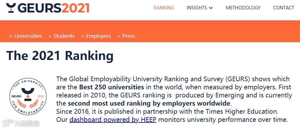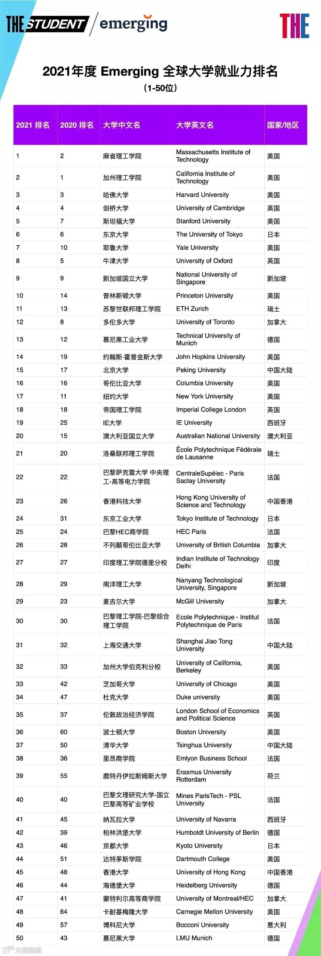 日前,泰晤士高等教育(THE)独家发布全球大学就业力排名。该排名由人力资源咨询公司Emerging编制,充分展示了在顶级公司的管理者眼中,哪些大学在提升学生就业力和步入职场的准备程度上具有最佳的表现。据说,这是目前全球雇主使用率第二高的排名。