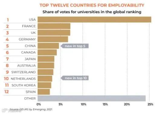 中国大陆高校也获得了雇主们的广泛认可,首次在国家/地区总评中进入世界TOP5。