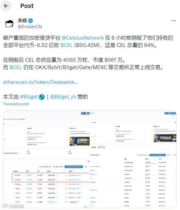 在销毁后 CEL 总供应量为 4055 万枚,市值 561 万。而 CEL 仍在 OKX/Bybit/Bitget/Gate/MEXC 等交易所正常上线交易。
