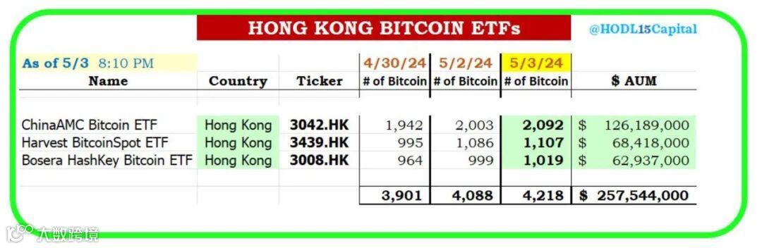 5月4日据 HODL15Capital 数据显示,香港比特币现货 ETF 上市三天后,已持有 4,218 枚 BTC,每支 ETF 至少持有 1000 枚 BTC。