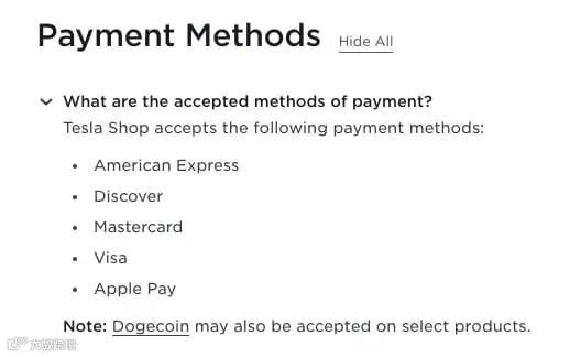5月4日据《韩国经济》报道,特斯拉网站信息显示,新增狗狗币作为支付方式。