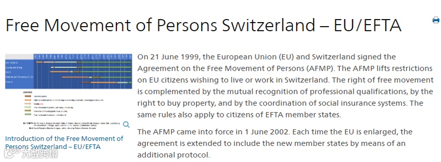 协议规定了欧盟公民前往瑞士自由工作和居住的权利。欧盟公民前往瑞士自由工作包括被雇佣和自雇两种形式。欧盟公民拥有足够的经济支持,和私人医疗保险,有权前往瑞士居住。