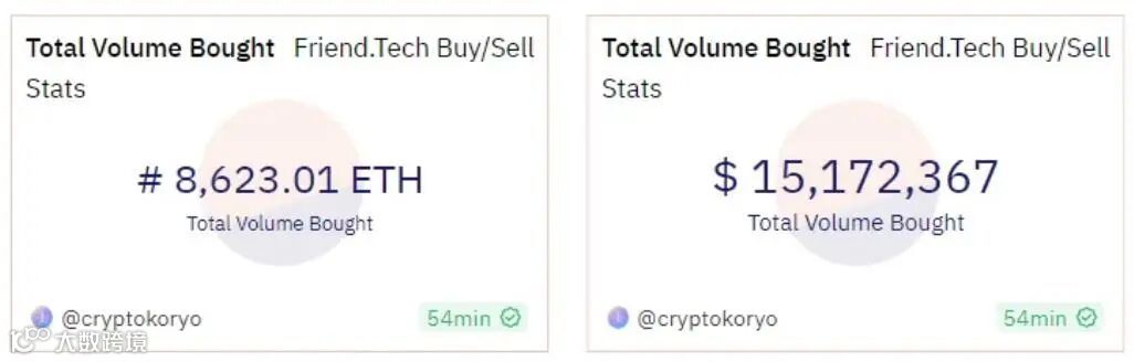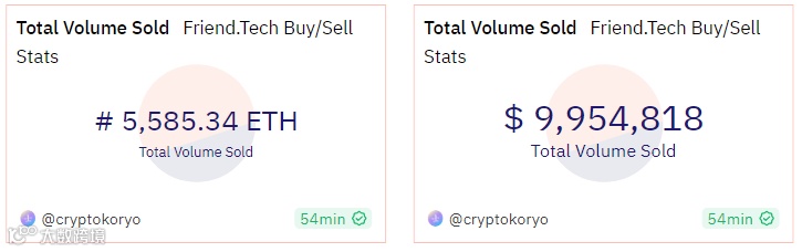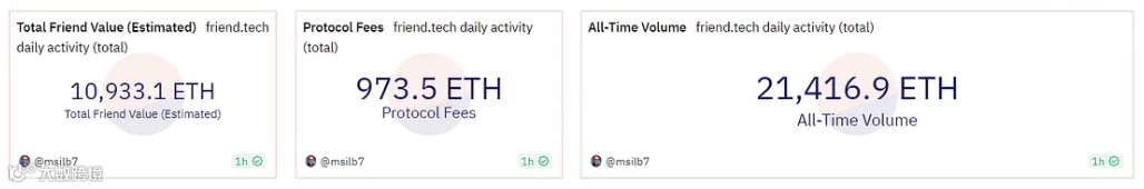 根据 Dune 数据面板数据,friend.tech 累计交易量达 2.1 万枚 ETH,价值约 3,500 万美金,该代币在被交易时会收取 10% 的交易费用,其中 5% 会分给被购买者,5% 归协议,目前协议收入达 973.5 ETH,价值约 163 万美元。