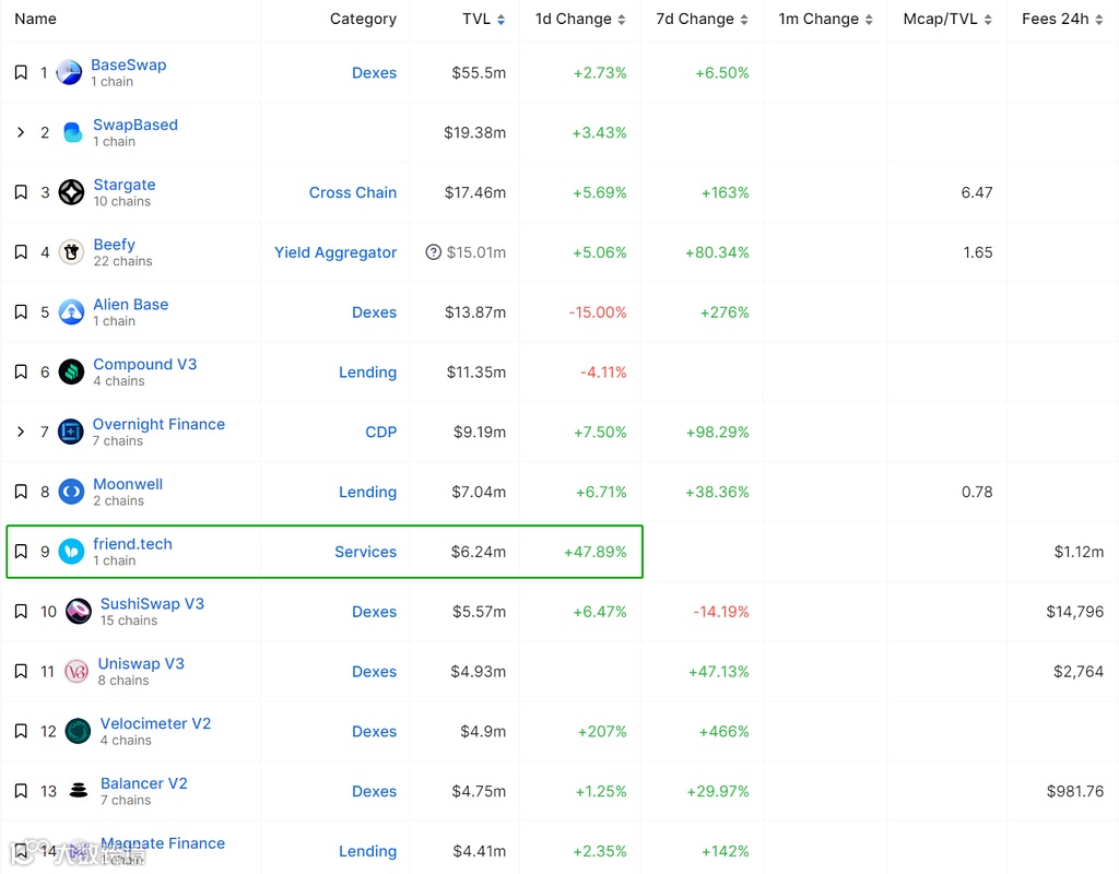 Base 链当前锁定资产价值(TVL)达 1.78 亿美元,friend.tech 资产价值 624 万美元,在其链上排名第 9 位,占比 3.5%。作为一款新上线的社交应用,其资产增速算是比较快的。