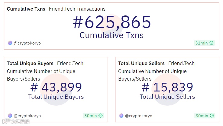 依据 dune 数据面板显示,Friend.tech 当前累计交易笔数达到约 62.6 万,买方约 4.4 万,卖方约 1.6 万个。8 月 18 日,在 Friend.tech 首次发放每周五积分空投后,交易双方数量都出现大幅度增长。