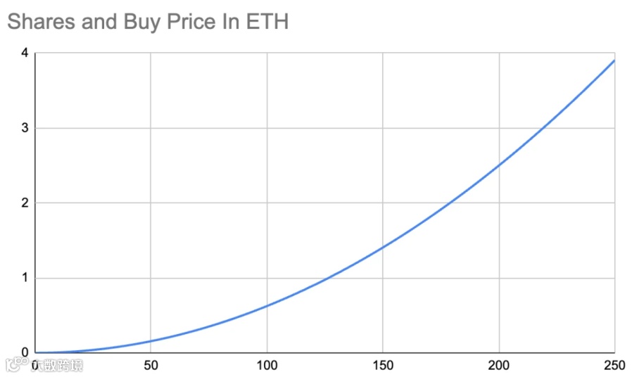 在这个协议中,你购买某位博主份额(代币)的价格是在不断变化中的,协议的开发人员设置了一个函数,其公式为:Price in ETH = Supply ^ 2 / 16000。其中 Supply 代表个人拥有的当前股份数量,每一份份额的价格随著购买人数递增呈“指数变化”。