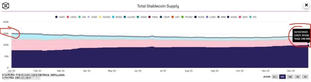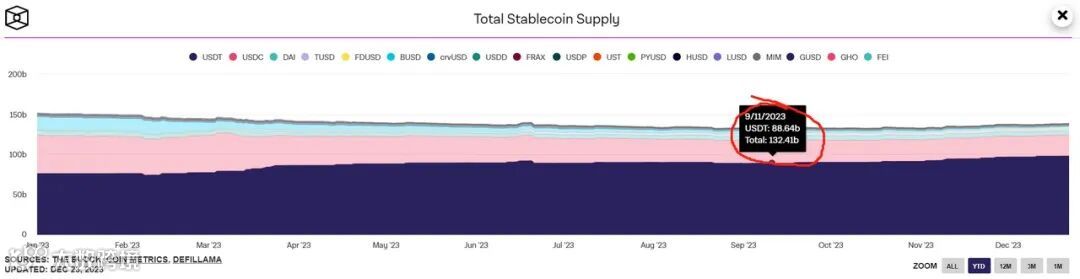 23年年初稳定币市值1500亿美金,23年9月是稳定币近一两年最少的时候,市值1324亿美金,市场流出了近180亿美金。