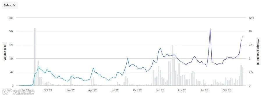 传统的PFP的故事已经很难让大家买单了。下图是BAYC的最近一两年的价格走向。在2022年Yugalabs还推出了APE+猴地的组合拳,让市场fomo一时。