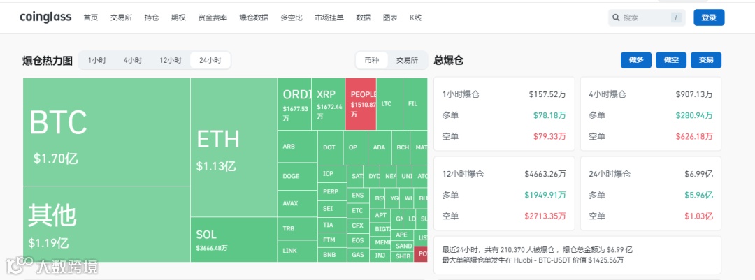 据Goinglass数据显示,24小时内爆仓金额达到6.99亿美元,多单达到5.96亿美元,空单1.03亿美元。