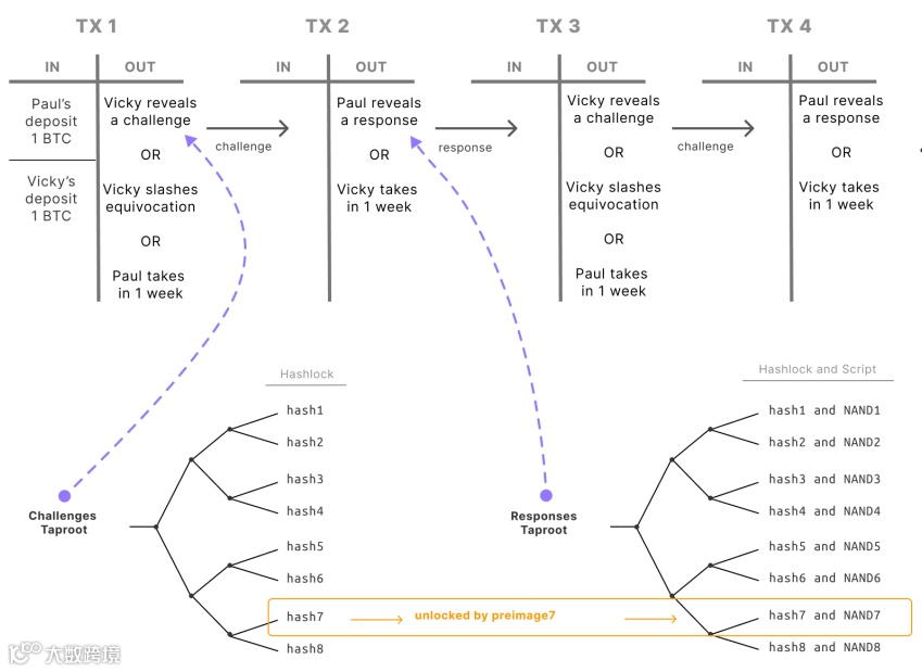 链下计算:BitVM 的独创性在于它对计算工作负载的处理。与将大量计算负担放在链上的传统区块链操作不同,BitVM 的大部分复杂计算在链下执行的。链下计算提供了更高的速度和灵活性,减少了直接存储在链上的数据量。
