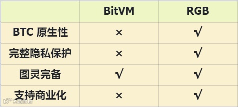 BTC 原生性:BitVM 需要对比特币进行协议更改,而 RGB 可以用软分叉实现