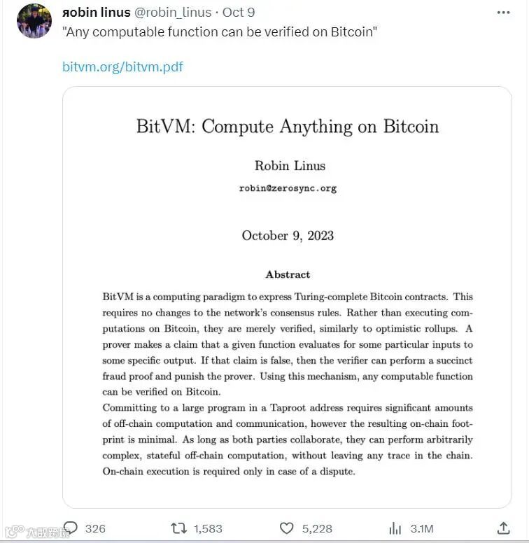 10月9日,区块链开发商 ZeroSync 的联合创始人 Robin Linus 公布了BitVM 的白皮书。