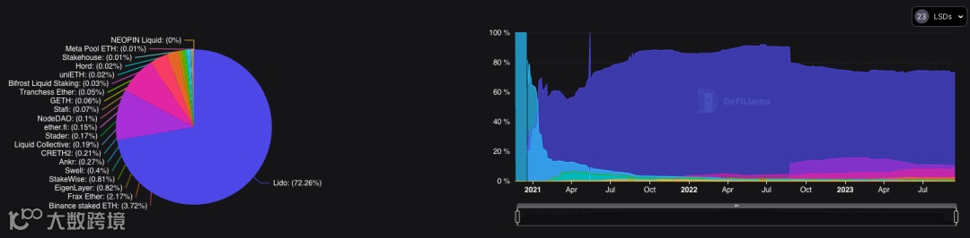 Lido 是迄今为止最大的质押提供商,占所有质押 ETH 的 72%。
