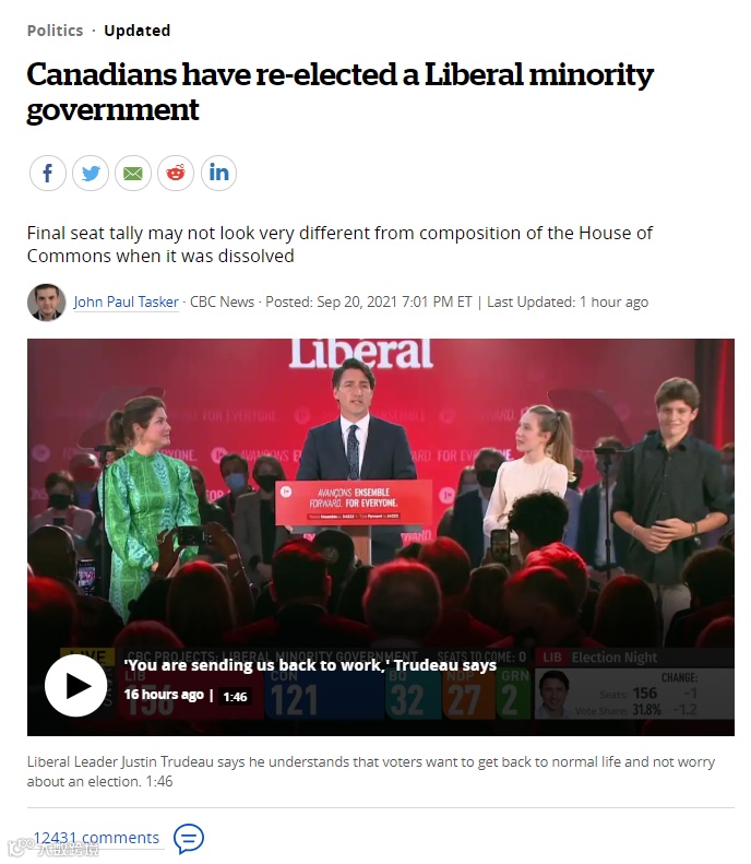 加拿大时间2021年9月21日,加拿大第44届联邦大选尘埃落定,自由党以158票提前胜出大选,Justin Tredeau成功第三次连任加拿大总理。