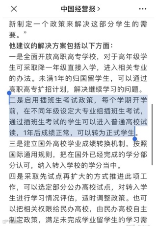 不过我们也要放平心态去看这个提案,其实是四种让归国留学生有学上的方案之一。但是估计大多数已经家里投资几十万上百万出国的留学生,是不会转学入国内高职大专的。不知道这份提案的可行性有几成。