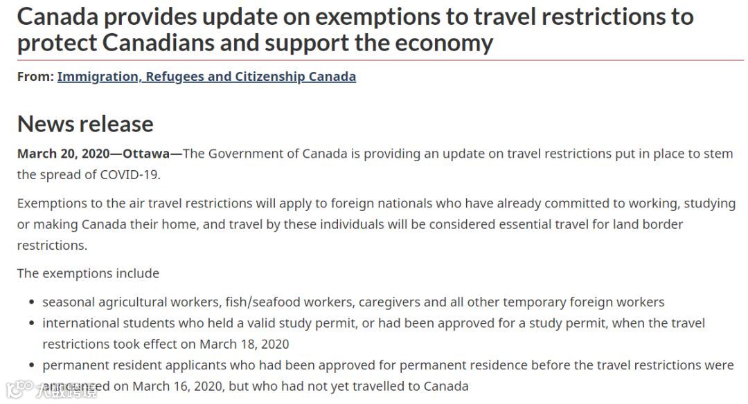 3月20日,加拿大政府更新了限制人员入境的措施,将对部分群体实施豁免入境。