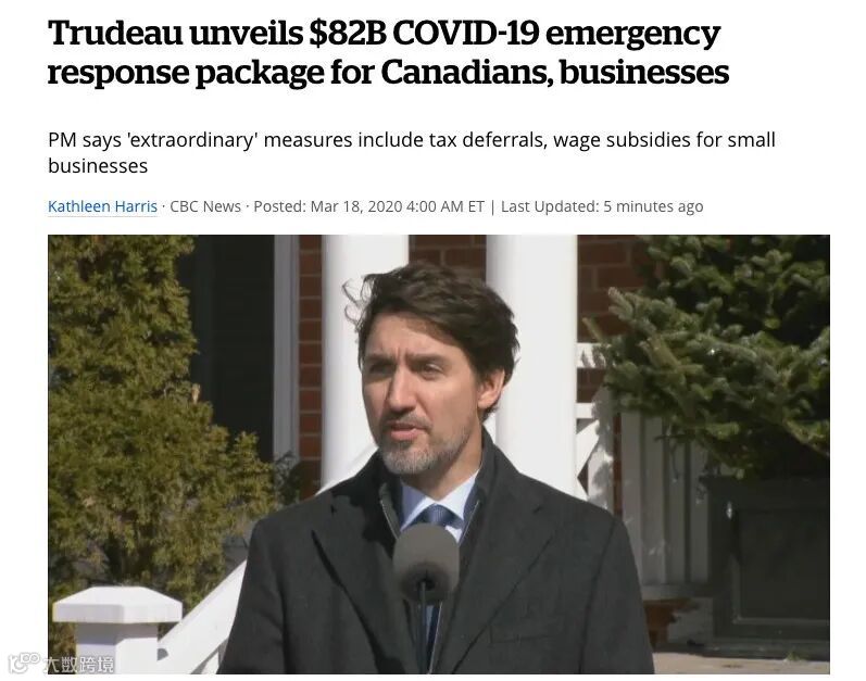 疫情发生以来,加拿大出台了各项人性化的暖心政策,此前特鲁多曾宣布将拨款应对疫情,加拿大时间3月18日,总理特鲁多公布新的820亿经济援助计划,以应对新冠病毒疫情,援助计划包括收入支持、工资补贴和延期纳税等。