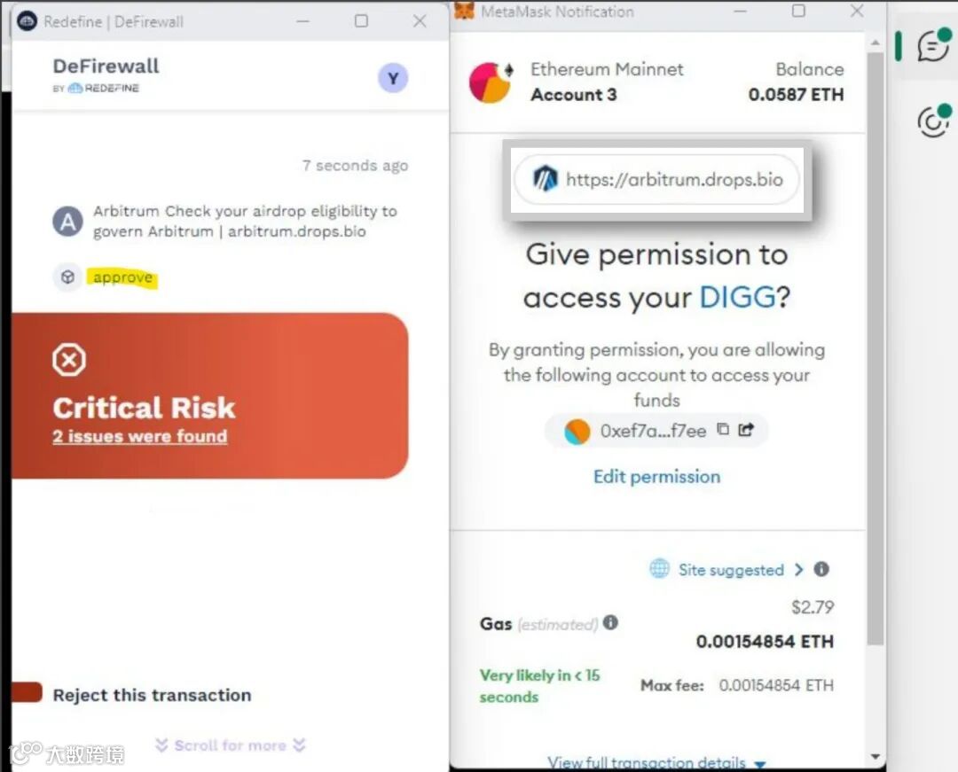而这一步往往出问题。因为参与者盯着空投,黑客也盯着空投。所以黑客会搭建一些和活动网站十分相似的钓鱼网站欺骗用户连接钱包签署交易,从而盗走资金。