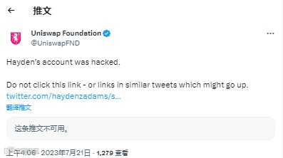 Uniswap 基金会也立刻在推特上发文告诉公众,Hayden 的账户遭到黑客攻击,不要点击此账户的任何链接!
