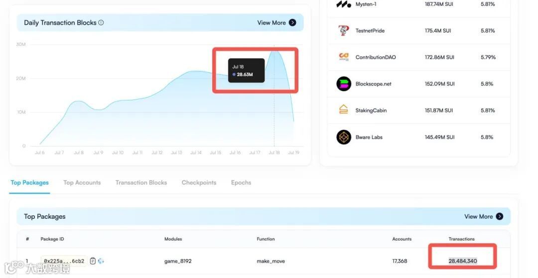 7月19日,SuiVision数据显示,Sui Network 日交易笔数突破 2863 万笔,达 28,631,718笔,创主网上线以来新高,其中链游 Sui 8192 的交易为 28,484,340 笔,占比约 99%。