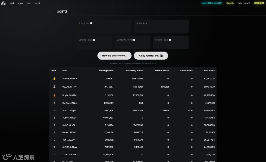 目前该平台还没有发行代币,但MarginFi 采用了一个非常有意思的积分系统,怎么说?举个例子!每借出一美元,每天可获得 1 个积分;每借入一美元,每天可获得 4 个积分。
