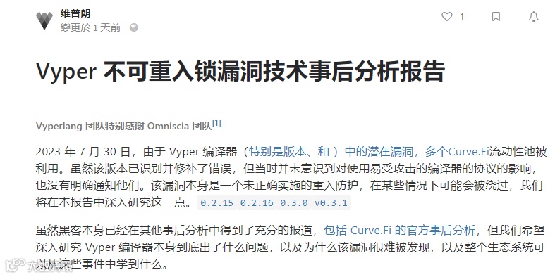 8月6日,以太坊编程语言Vyper的开发团队就上周漏洞事件发布了分析报告:此前Vyper 编译器中的潜在漏洞,导致多个 Curve 流动性池被攻击。该漏洞是由于重入防护没有正确执行,受影响的 Vype 版本为 v0.2.15、v0.2.16、v0.3.0。