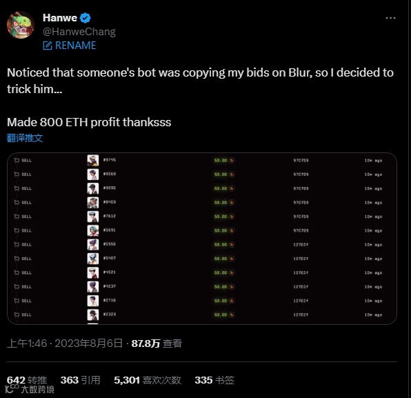 在上周末NFT市场上演了一出好戏,推特上的NFT大佬 Hanwe (@HanweChang) ,发现在Blur上有机器人bot模仿跟随自己的报价策略,于是决定“戏耍”一下这个机器人。