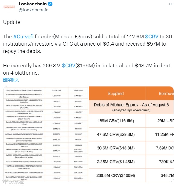 此前Michael Egorove通过OTC以0.4美元的价格向30家机构和投资人售出总计1.42亿枚CRV。