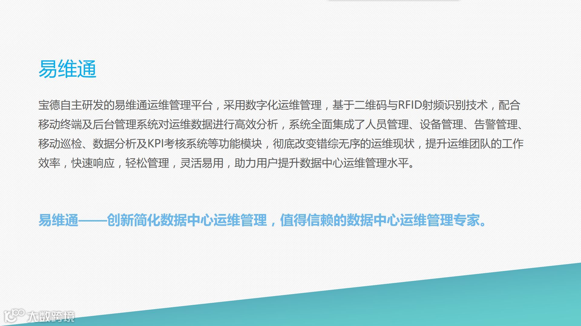 宝德自主研发的智能化运维系统——易维通,采用数字化运维管理,基于二维码与RFID射频识别技术,配合移动终端及后台管理系统对运维数据进行高效分析,系统全面集成了人员管理、设备管理、告警管理、移动巡检、数据分析及KPI考核系统等功能模块,彻底改变错综无序的运维现状,提升运维团队的工作效率,快速响应,轻松管理,灵活易用,助力用户提升数据中心运维管理水平。