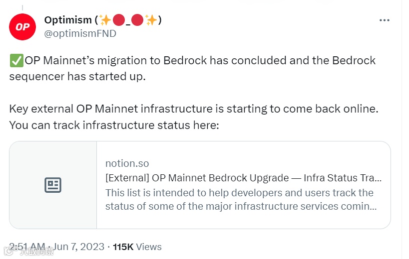 6月7日,Optimism已于北京时间6月7日凌晨2点50分完成主网Bedrock升级,存取款服务已恢复,OP主网已重新运行。
