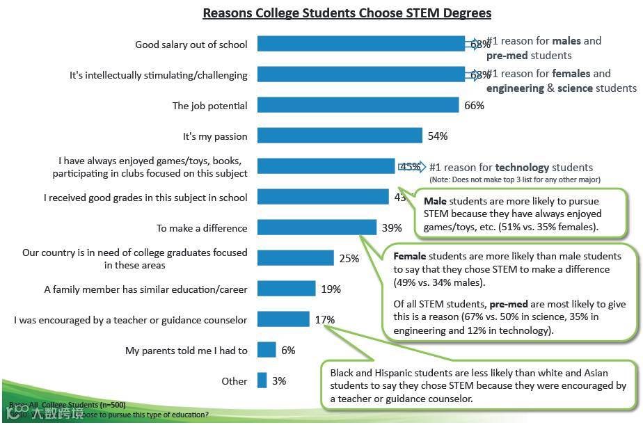从上述调查中可以看出,68%的男同学认为Good Salary(收入高)是选择STEM专业的第一因素。68%的女同事认为Challenging (具有挑战性)是选择STEM专业的第一原因。排在第二的原因则是因为这个专业的工作十分有POTENTIAL (潜力), 随后第三个原因则是对这个专业有Passion (热情)以及兴趣。