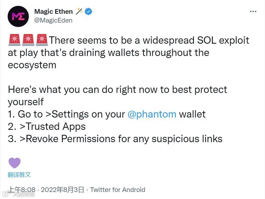 8月3日,有人在社交媒体警告称Solana可能存在漏洞。随后区块链审计安全团队OtterSec在社交媒体上紧急发文表示,已经有超过5000个Solana区块链上的钱包资金被盗取。