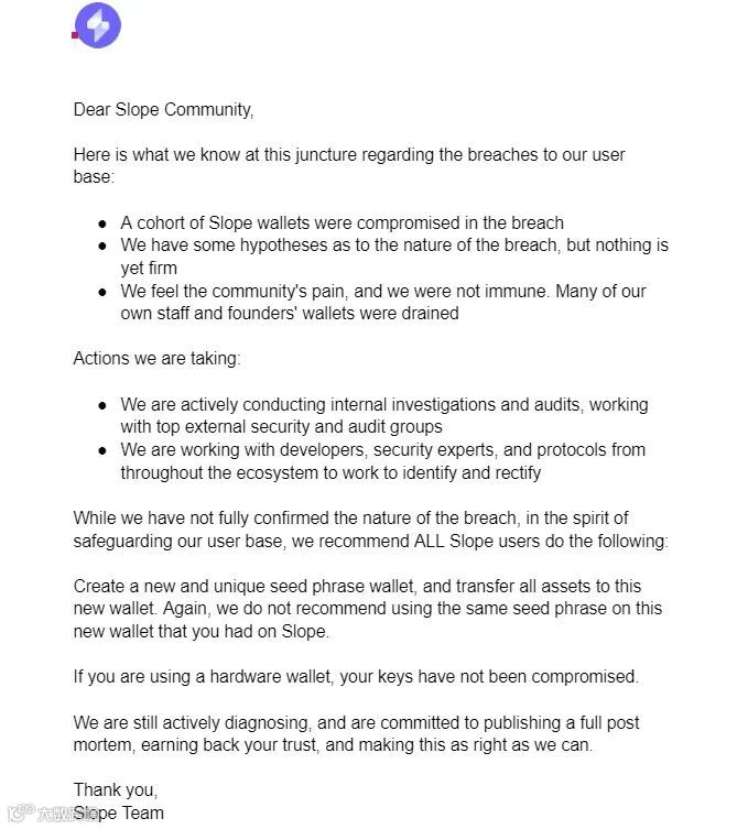 Solana团队在调查后说,这次链上钱包大规模被盗很可能与Slope钱包有关,因为所有的被盗地址都在Slope钱包上创建和导入。他们还调查发现,Slope钱包的私钥曾经被传到一个应用监测平台,随后就发生了大量钱包被盗。