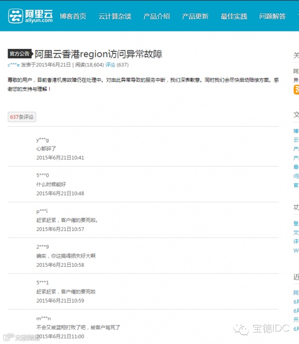 2015年6月21日,阿里云香港节点出现全线宕机,业务中断超过12小时,甚至有部分用户数据出现损毁,在业界引发轰然大波。