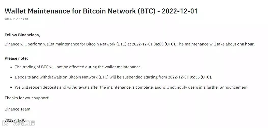 11月30日,币安官网发布,其将于北京时间12月1日14时对比特币网络(BTC)进行钱包维护,大约需要一个小时时间。钱包维护期间,BTC交易将不受影响。比特币网络(BTC)的存取款将从12月1日13:55开始暂停。币安将在维护完成后重新开放充提服务,不再另行通知。