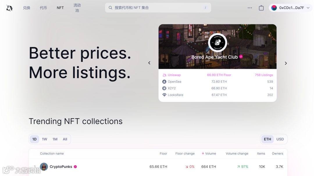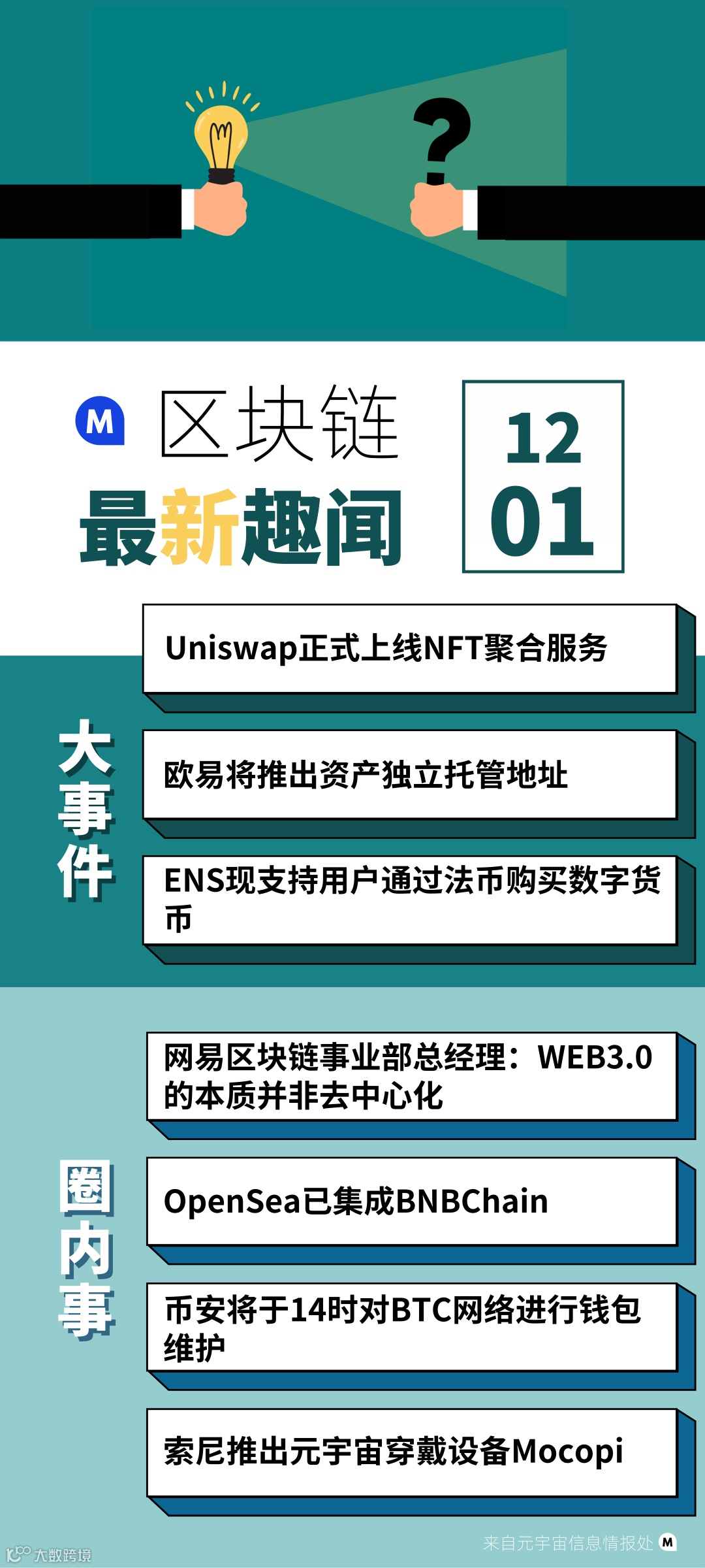 11月30日,Uniswap官网宣布,正式上线NFT聚合服务,并称Uniswap NFT聚合器将为用户提供更好的价格、更快的索引,以及更安全的智能合约。在发布初期,Uniswap将支持OpenSea、X2Y2、LooksRare、Sudoswap、LarvaLabs、Foundation、NFT20和NFTX。知名NFT项目如无聊猿、加密朋克、ArtBlocks等均在该聚合服务中。