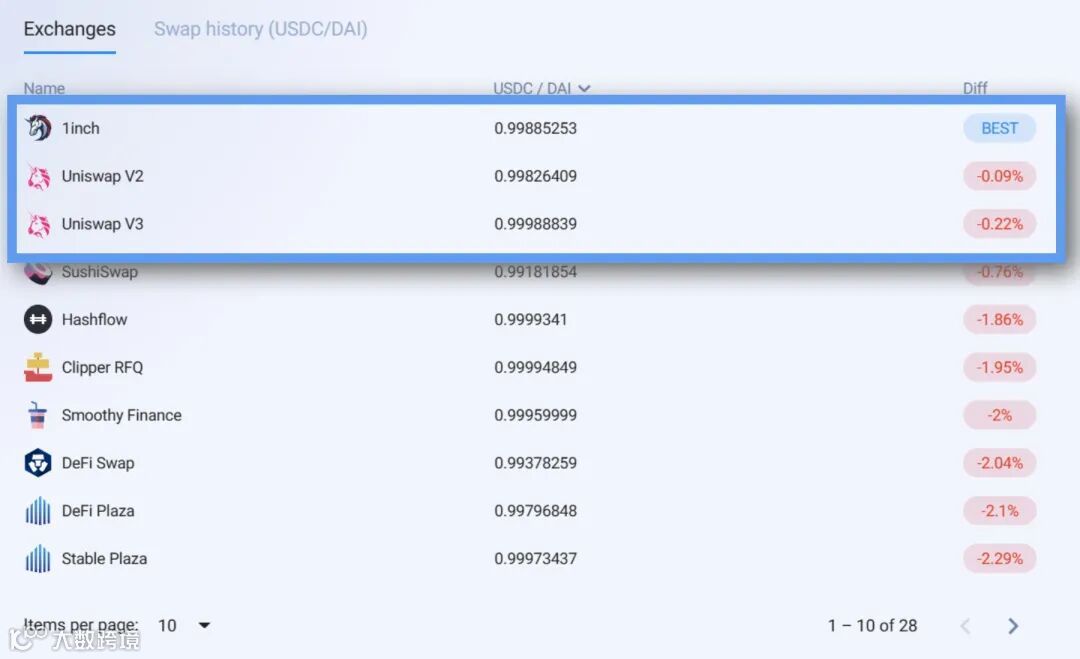 拿以太坊举例,用户使用USDC购买DAI时,1 inch会直接生成价格面板,比较不同交易所之间的汇率差异,可以看出在Uniswap之外,1 inch为用户兑换提供了更好的选择。