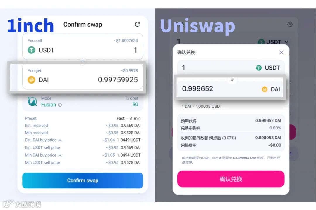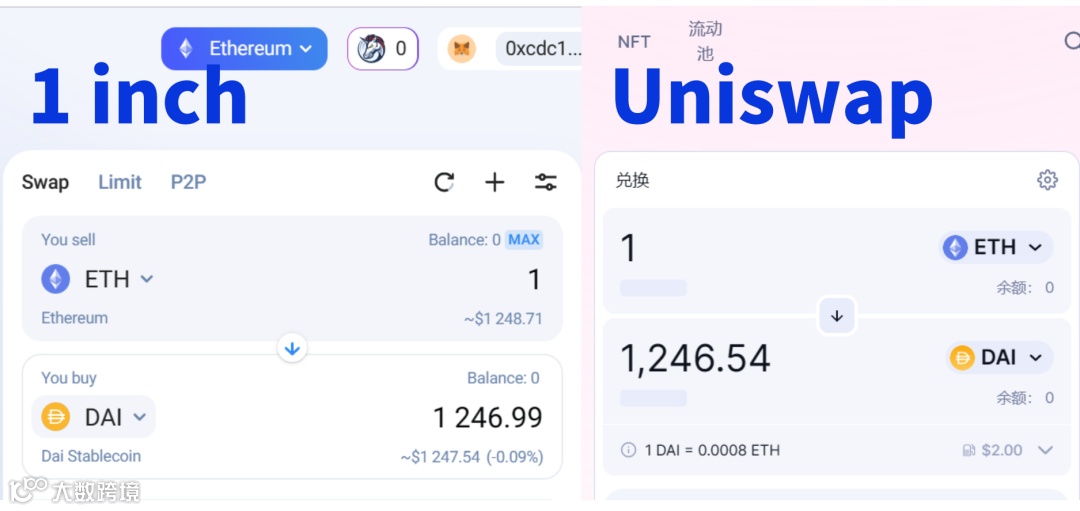但在以太坊上,使用1 inch通过ETH兑换DAI的价格则明显优于Uniswap。