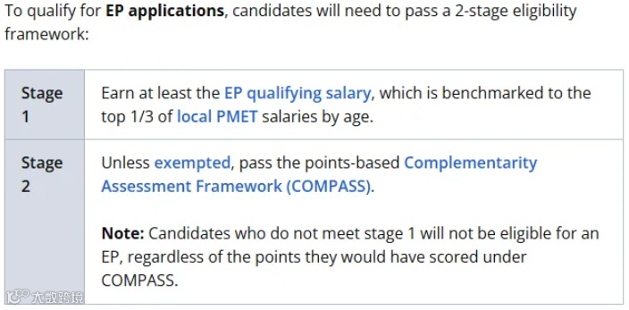 特别值得注意的是,即使月薪达到22,500新元可豁免COMPASS评估,仍需满足第一阶段的合格薪资要求,且公司不能虚报薪资,否则会被驳回。这表明,高薪不再是EP申请的"万能钥匙",申请者需同时满足多维度要求。