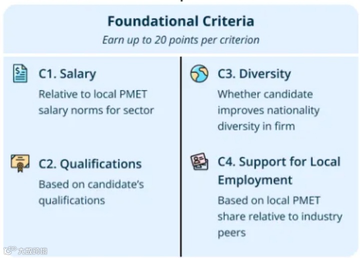 对于小型企业(PMET少于25人),在员工国籍多元化和本地员工占比两项可自动各得10分,大大降低了申请难度。
