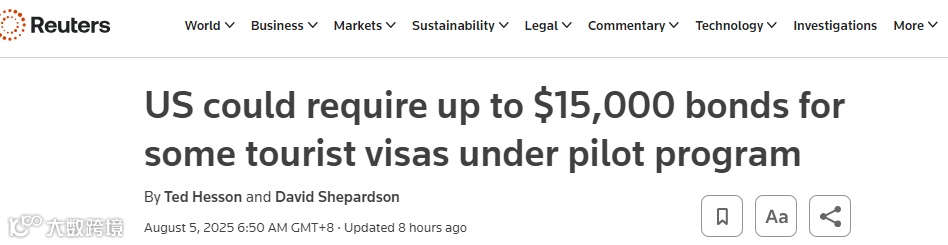 从8月20日开始,想去美国旅游或出差的某些国家公民,可能得先准备一笔不小的“押金”了。