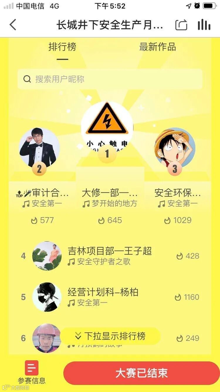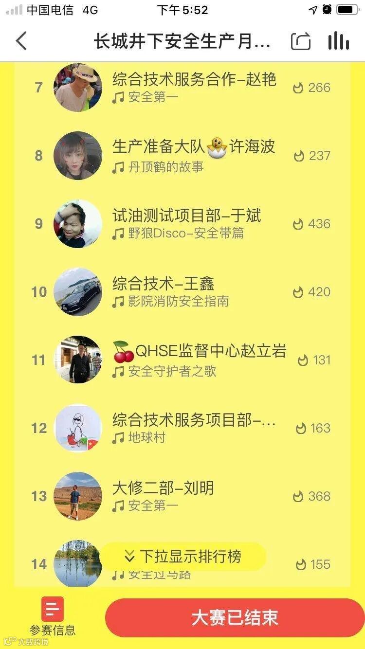 线上安全环保类歌曲比赛《安全第一》《梦开始的地方》等安全环保类歌曲,在井下作业公司线上歌曲比赛排名中激烈角逐,不断在员工的微信朋友圈被转发和收听。点开比赛链接,来自各科室、项目部的36名参赛人员精神饱满、歌声嘹亮,共同提交安全环保类歌曲作品46个,为大家带来精彩的听觉盛宴,送上健康与安全祝福。活动总点收听量达7880人次,不仅在公司内部引起热议、广为传播,而且留言区还有不少兄弟单位和上级部门领导的给予的鼓励和赞许。