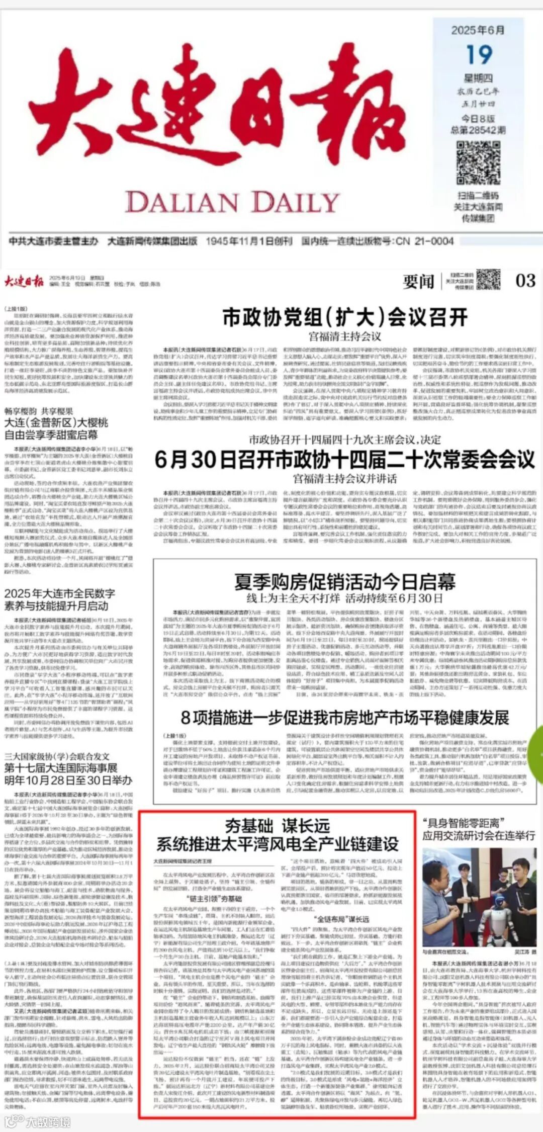 2025年初,太平湾下属参股企业成功竞配辽宁省80万千瓦的海上风电指标,同时,兼顾大连市具备的以大连重工(齿轮)、瓦轴集团(轴承)等为代表的风电产业链基础,太平湾合作创新区将构建风电全产业链条,进一步打造风电产业集群,实现太平湾风电产业2.0模式。