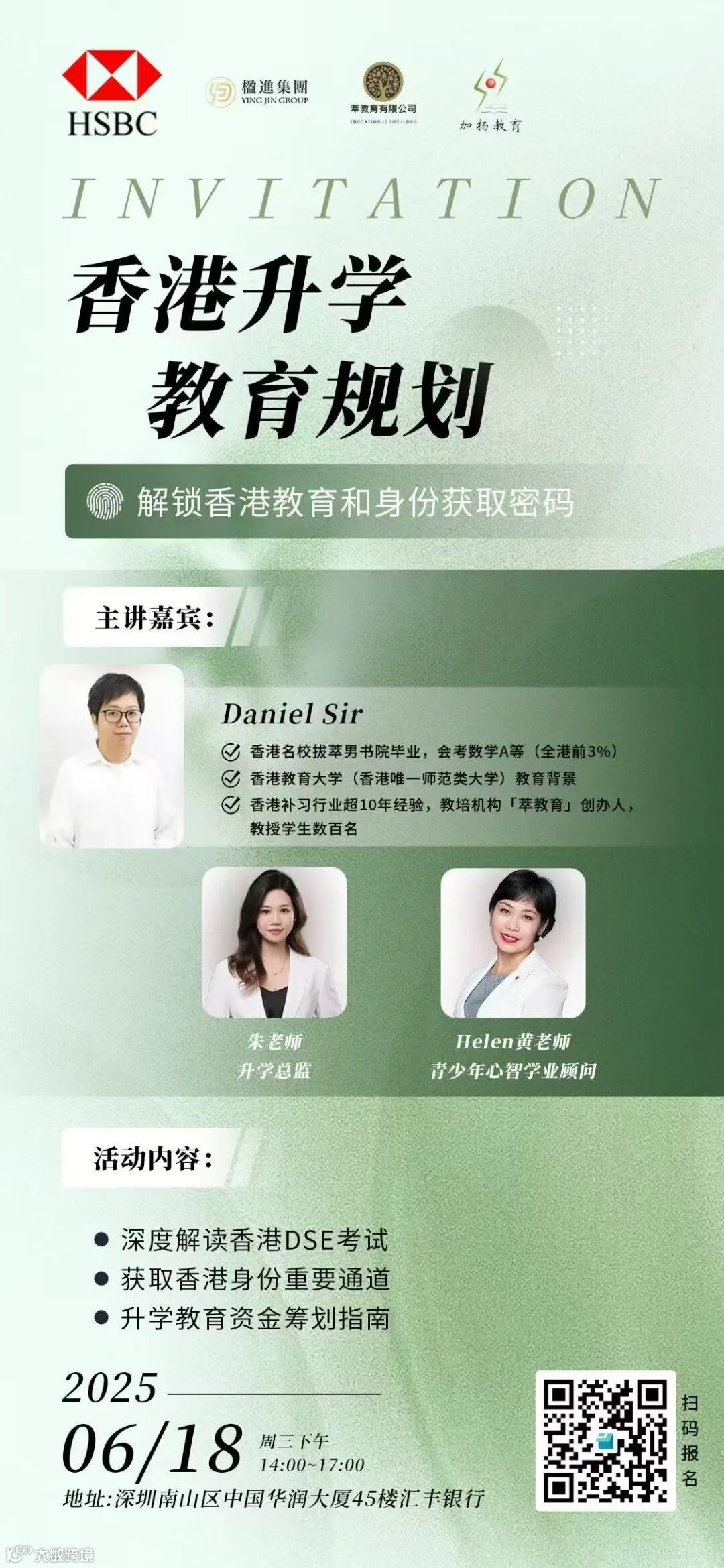 6月18日,楹进集团深圳公司联合汇丰银行深圳湾分行将举办《香港升学与教育规划》主题活动,深入聚焦香港教育领域,为有需求的家庭提供更细分、更精准的规划指导。